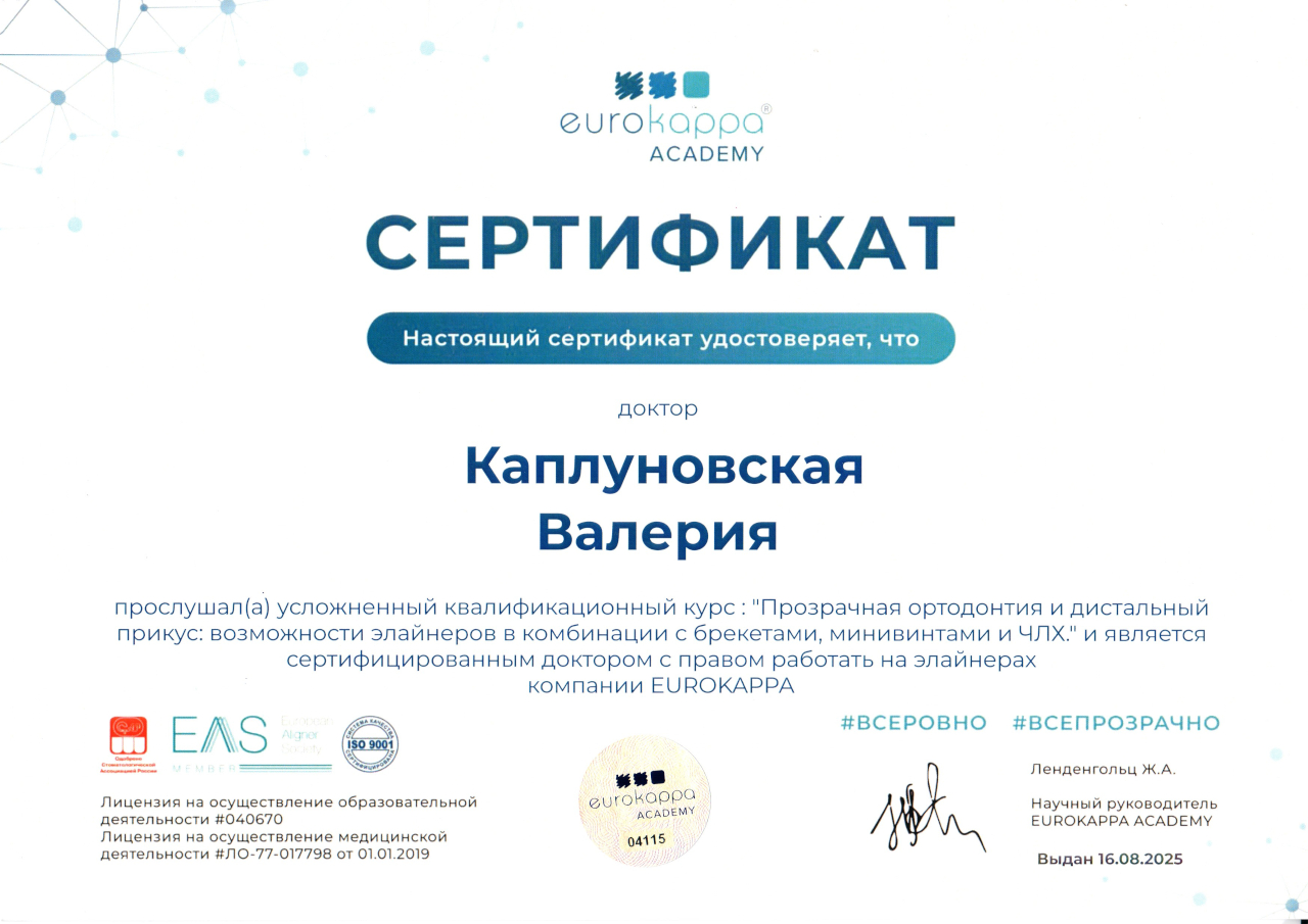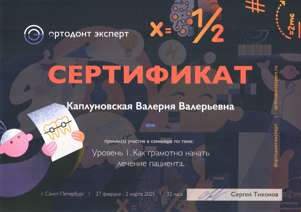 - Ординатура в ТвГМУ по специальности «Ортодонтия».